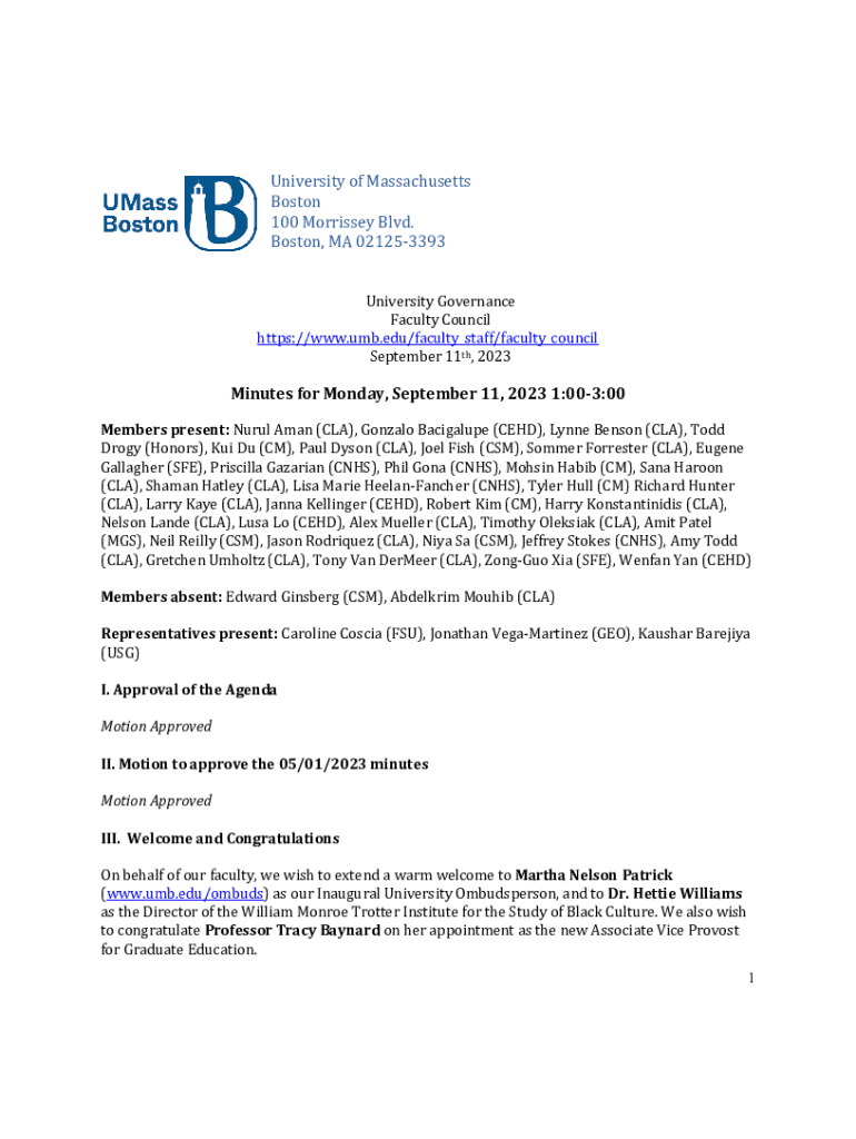 University of Massachusetts Boston 100 Morrissey Blvd. Boston, MA 021253393 University Governance Faculty Council https://www.umb.edu/faculty_staff/faculty_council September 11th, 2023Minutes for