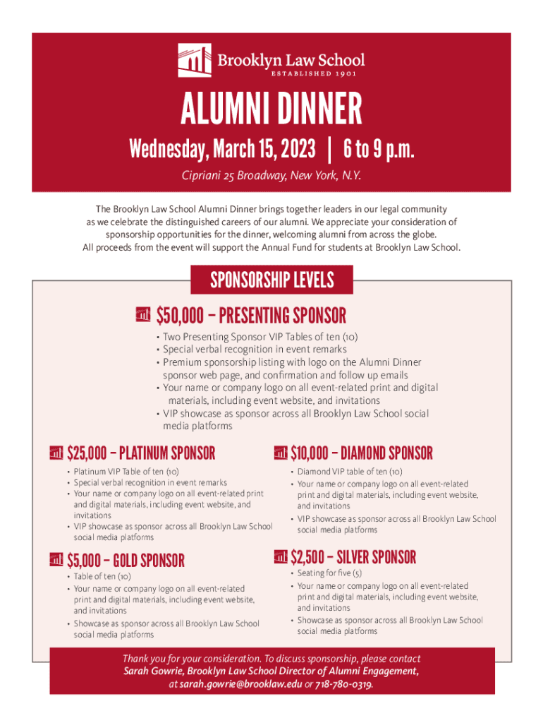 ALUMNI DINNERWednesday, March 15, 2023 | 6 to 9 p.m. Cipriani 25 Broadway, New York, N.Y. The Brooklyn Law School Alumni Dinner brings together leaders in our legal community as we celebrate the distinguished