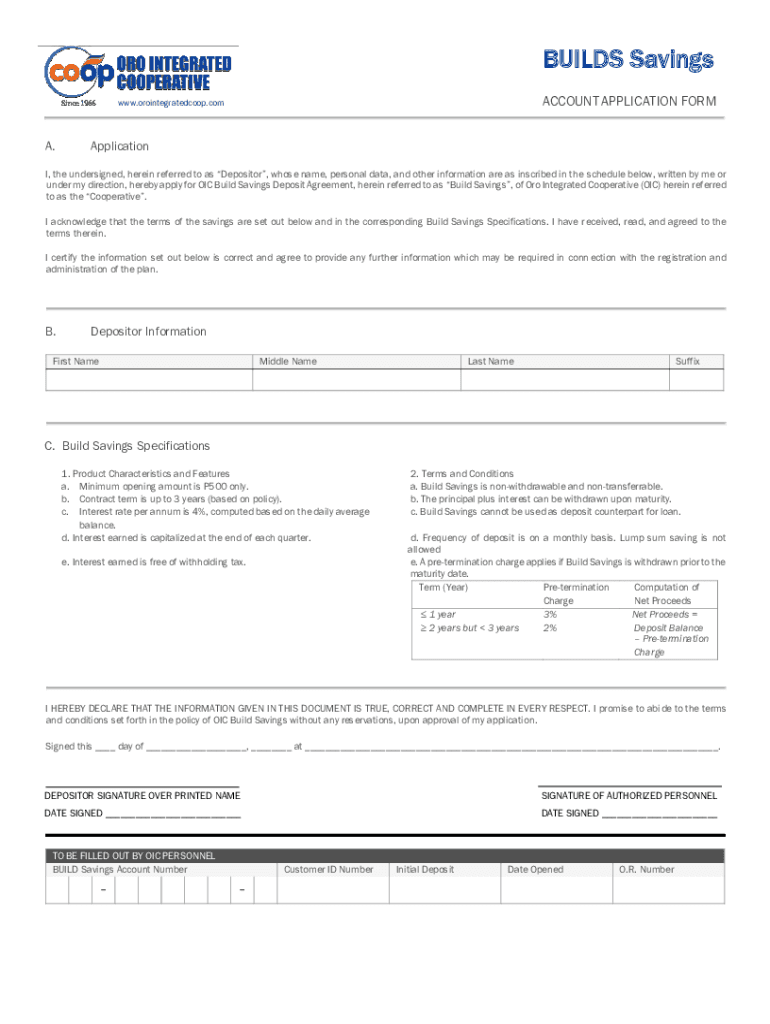 BUILDS Savings ACCOUNT APPLICATION FORMwww.orointegratedcoop.comA.ApplicationI, the undersigned, herein referred to as Depositor, whose name, personal data, and other information are as inscribed