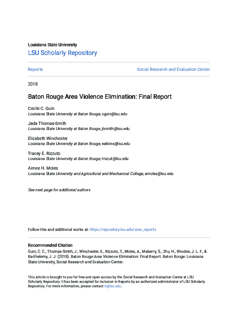 Louisiana State UniversityLSU Scholarly Repository ReportsSocial Research and Evaluation Center2018Baton Rouge Area Violence Elimination: Final Report Cecile C. Guin Louisiana State University at
