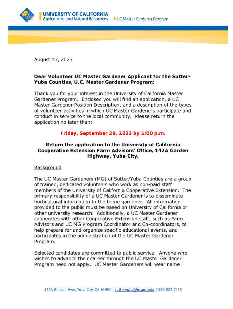 August 17, 2023 Dear Volunteer UC Master Gardener Applicant for the SutterYuba Counties, U.C. Master Gardener Program: Thank you for your interest in the University of California Master Gardener Program.