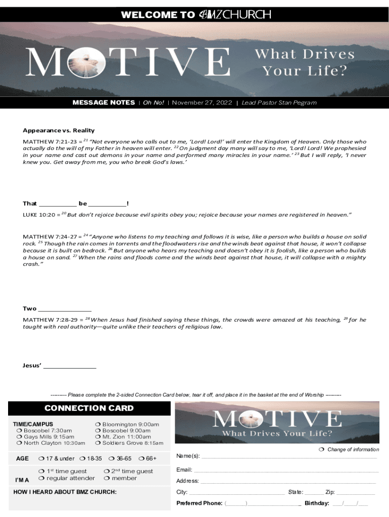WELCOME TOMESSAGE NOTES | Oh No! | November 27, 2022 | Lead Pastor Stan PegramAppearance vs. Reality MATTHEW 7:2123 21 Not everyone who calls out to me, Lord! Lord! will enter the Kingdom of Heaven.