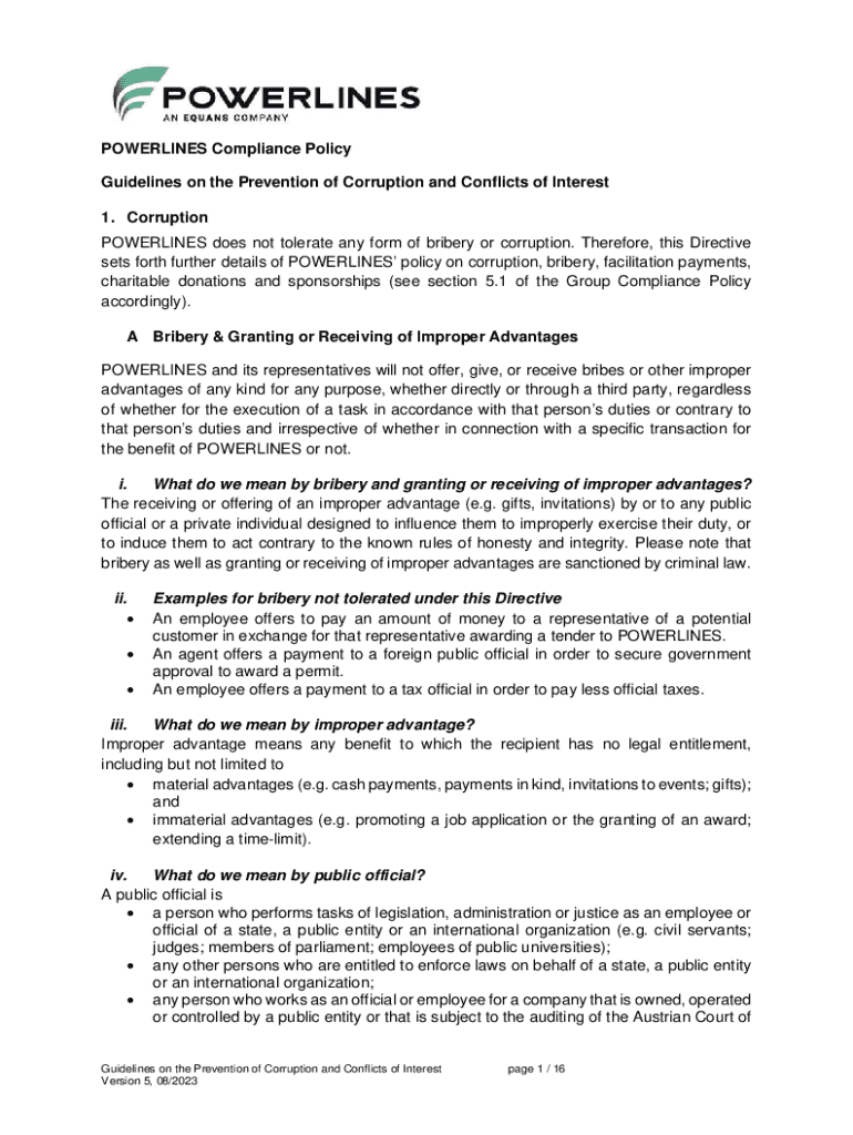 POWERLINES Compliance Policy Guidelines on the Prevention of Corruption and Conflicts of Interest 1. Corruption POWERLINES does not tolerate any form of bribery or corruption. Therefore, this Directive