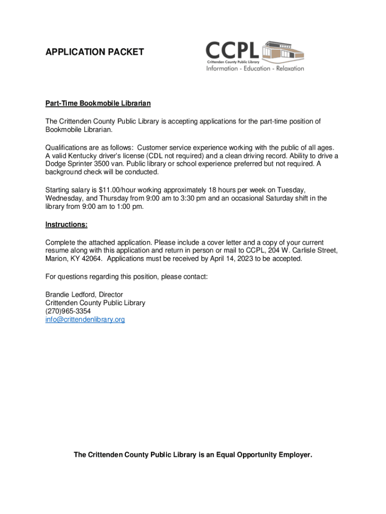 APPLICATION PACKETPartTime Bookmobile Librarian The Crittenden County Public Library is accepting applications for the parttime position of Bookmobile Librarian. Qualifications are as follows: Customer