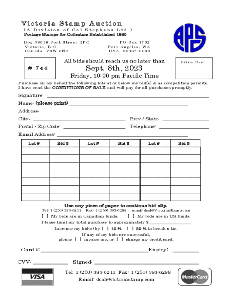 Victoria Stamp Auction (A Division of Cal Stephens Ltd.) Postage Stamps for Collectors Established 1980 Box 38038 Fort Street RPO Victoria, B.C. Canada V8W 3N2PO Box 1732 Port Angeles, WA USA 983620089All
