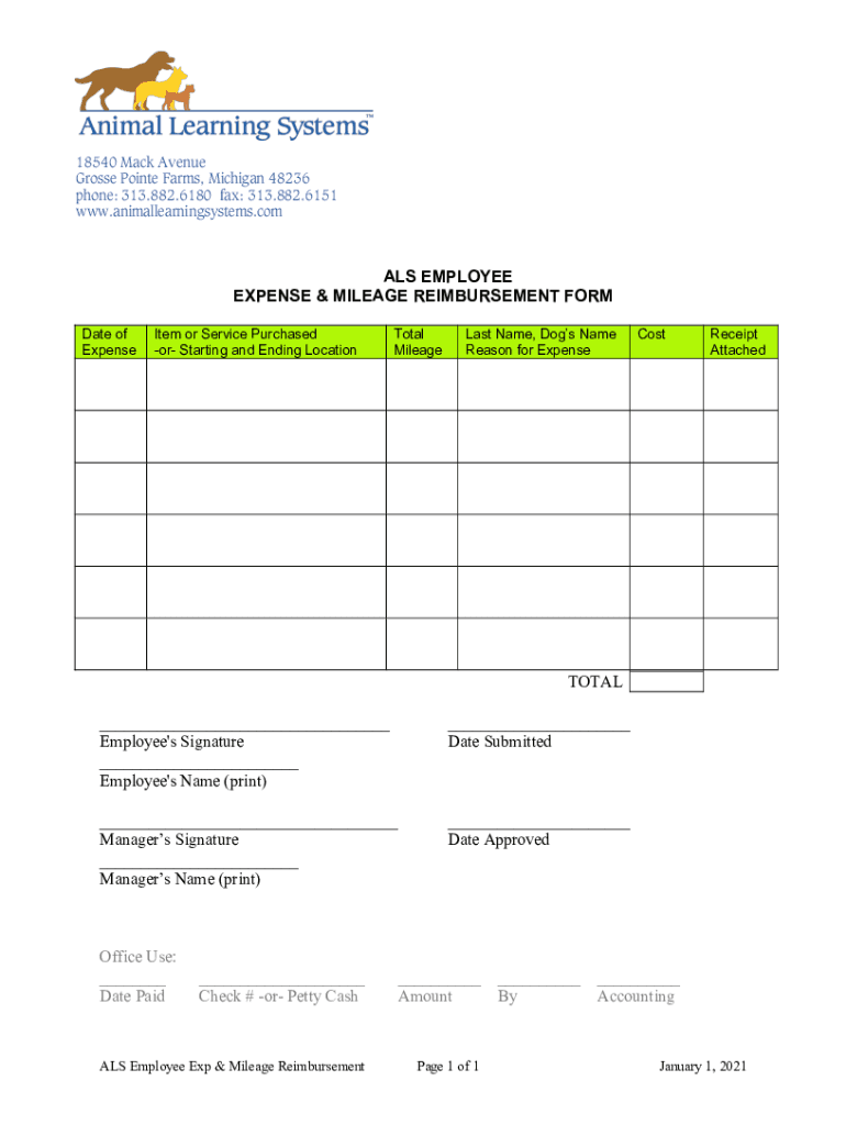 18540 Mack Avenue Grosse Pointe Farms, Michigan 48236 phone: 313.882.6180 fax: 313.882.6151 www.animallearningsystems.comALS EMPLOYEE EXPENSE & MILEAGE REIMBURSEMENT FORM Date of ExpenseItem or Service