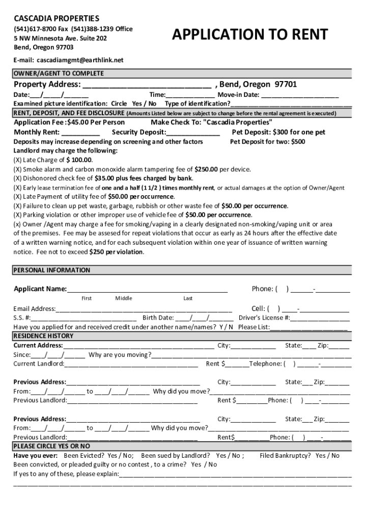 CASCADIA PROPERTIES(541)6178700 Fax(541)3881239 Office5 NW Minnesota Ave. Suite 202Bend, Oregon 97703APPLICATION TO RENTEmail:cascadiamgmt@earthlink.net