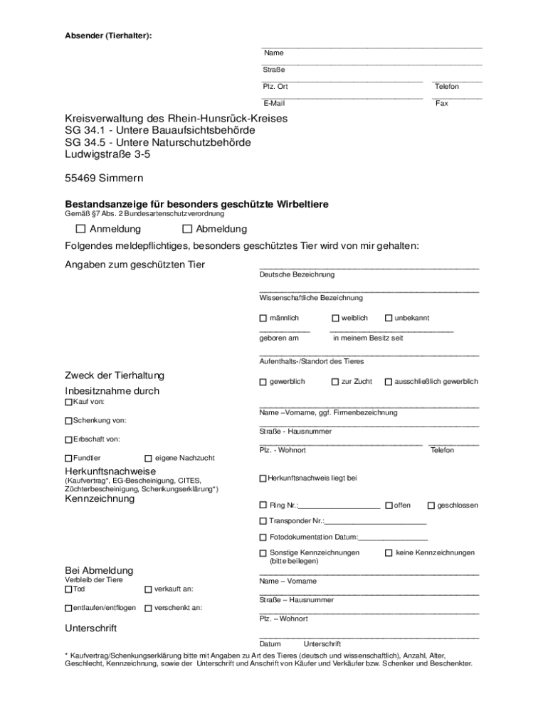 Absender (Tierhalter): ___ Name___ Strae___ Plz. Ort___ Telefon___ EMail___ FaxKreisverwaltung des RheinHunsrckKreises SG 34.1 Untere Bauaufsichtsbehrde SG 34.5 Untere Naturschutzbehrde Ludwigstrae