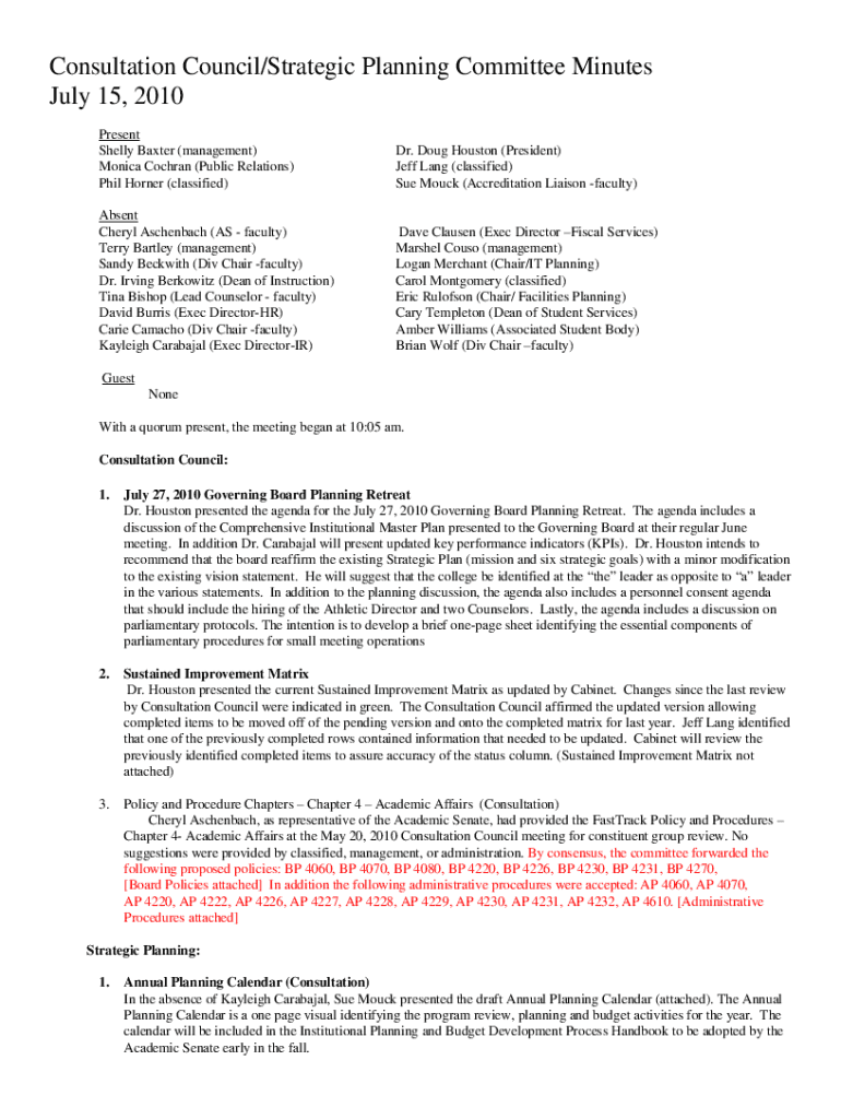 Consultation Council/Strategic Planning Committee Minutes July 15, 2010 Present Shelly Baxter (management) Monica Cochran (Public Relations) Phil Horner (classified)Dr. Doug Houston (President) Jeff