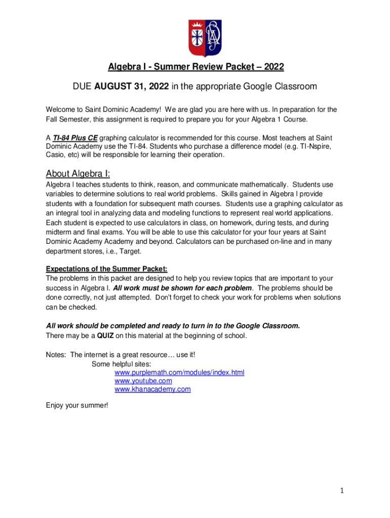 Algebra I Summer Review Packet 2022 DUE AUGUST 31, 2022 in the appropriate Google Classroom Welcome to Saint Dominic Academy! We are glad you are here with us. In preparation for the Fall Semester,