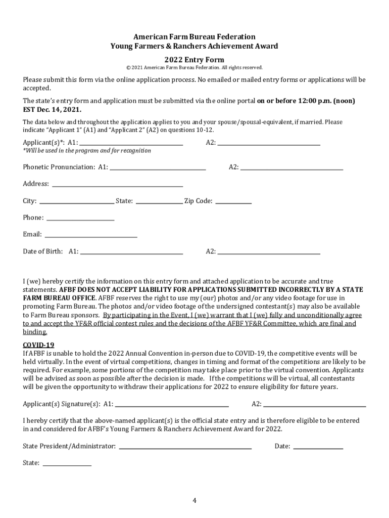 American Farm Bureau Federation Young Farmers & Ranchers Achievement Award 2022 Entry Form 2021 American Farm Bureau Federation. All rights reserved.Please submit this form via the online application