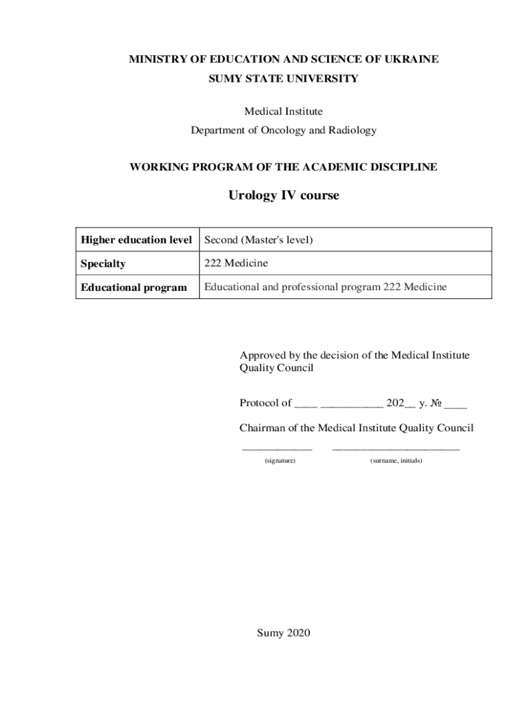MINISTRY OF EDUCATION AND SCIENCE OF UKRAINE SUMY STATE UNIVERSITY Medical Institute Department of Oncology and Radiology WORKING PROGRAM OF THE ACADEMIC DISCIPLINEUrology IV courseHigher education