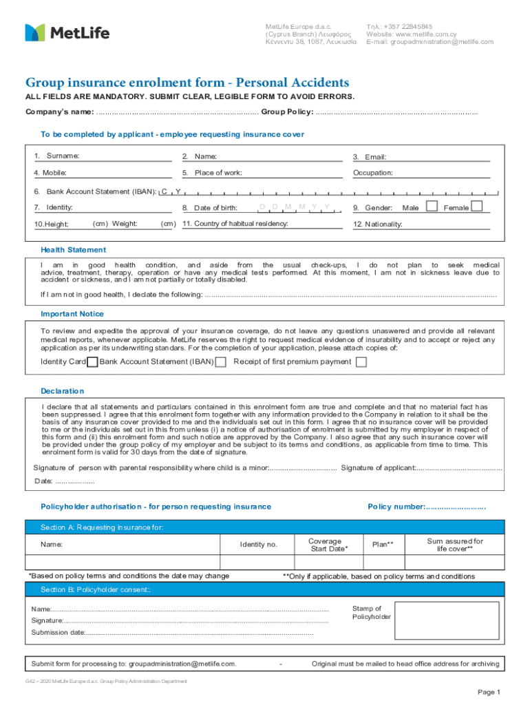 MetLife Europe d.a.c. (Cyprus Branch) 38, 1087, .: +357 22845845 Website: www.metlife.com.cy Email: groupadministration@metlife.comGroup insurance enrolment form Personal AccidentsALL FIELDS ARE MANDATORY.