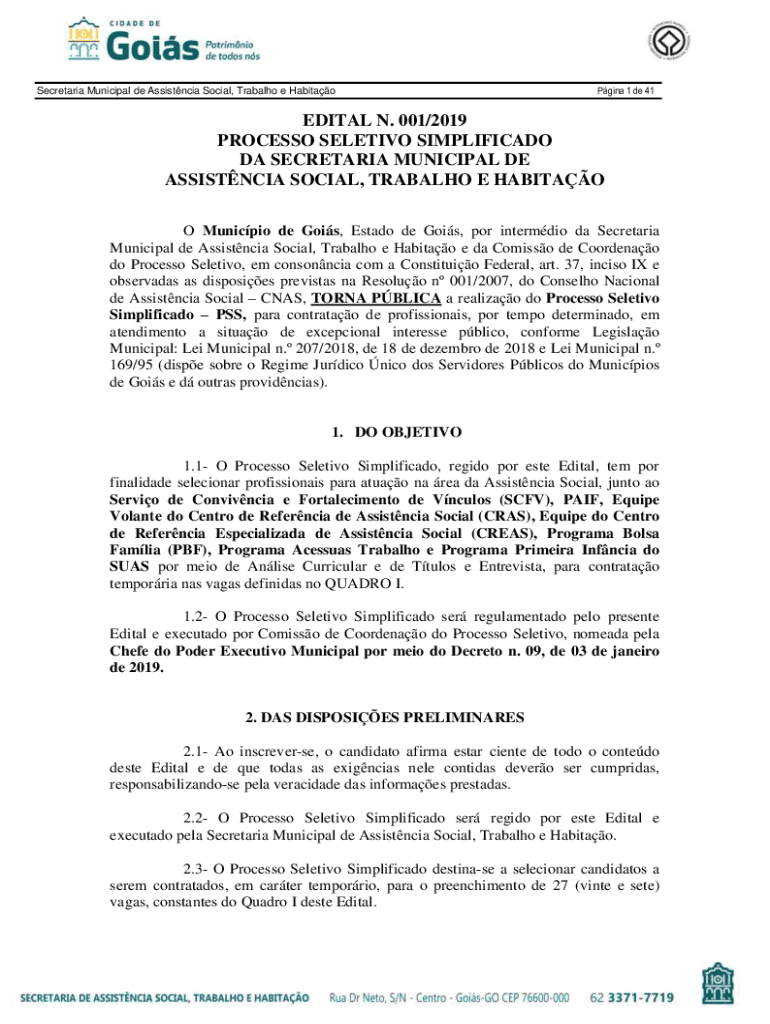 Secretaria Municipal de Assistncia Social, Trabalho e HabitaoPgina 1 de 41EDITAL N. 001/2019 PROCESSO SELETIVO SIMPLIFICADO DA SECRETARIA MUNICIPAL DE ASSISTNCIA SOCIAL, TRABALHO E HABITAO O Municpio