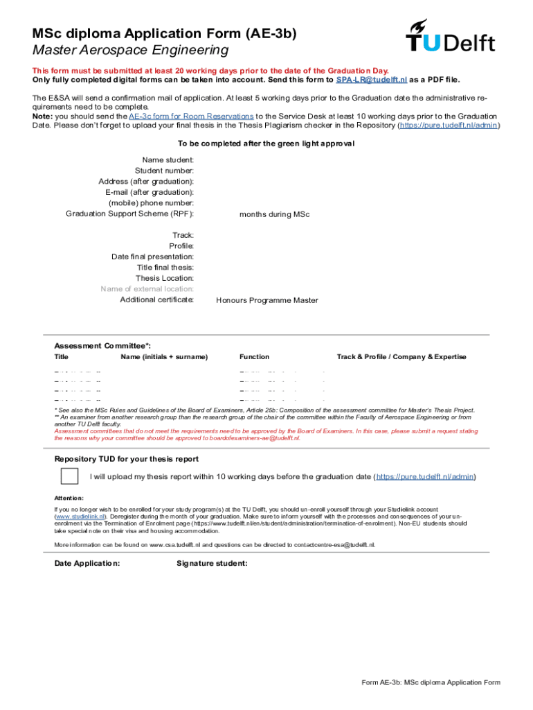 MSc diploma Application Form (AE3b) Master Aerospace Engineering This form must be submitted at least 20 working days prior to the date of the Graduation Day. Only fully completed digital forms can