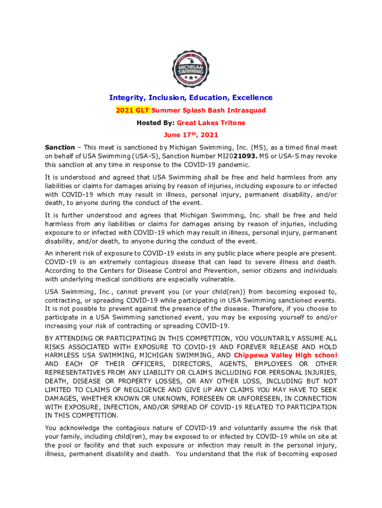 Integrity, Inclusion, Education, Excellence 2021 GLT Summer Splash Bash Intrasquad Hosted By: Great Lakes Tritons June 17th, 2021 Sanction This meet is sanctioned by Michigan Swimming, Inc. (MS),