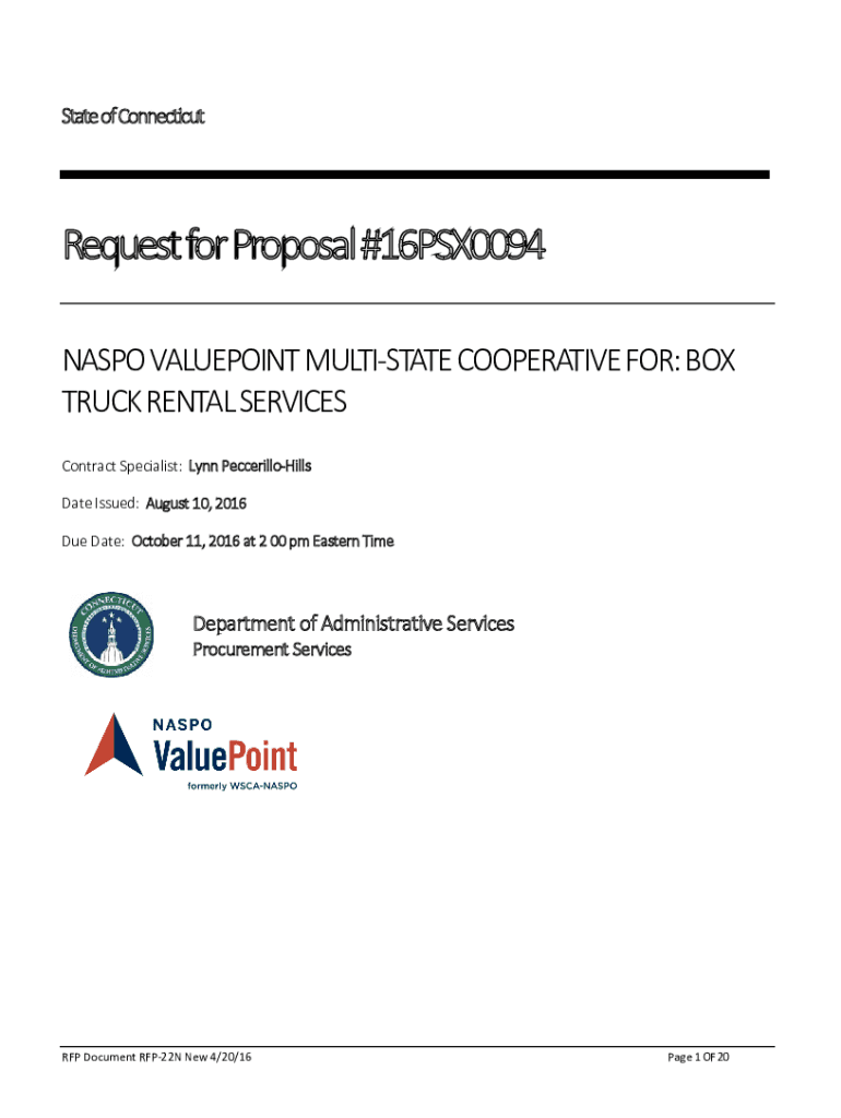 State of ConnecticutRequest for Proposal #16PSX0094 NASPO VALUEPOINT MULTISTATE COOPERATIVE FOR: BOX TRUCK RENTAL SERVICES Contract Specialist: Lynn PeccerilloHills Date Issued: August 10, 2016 Due