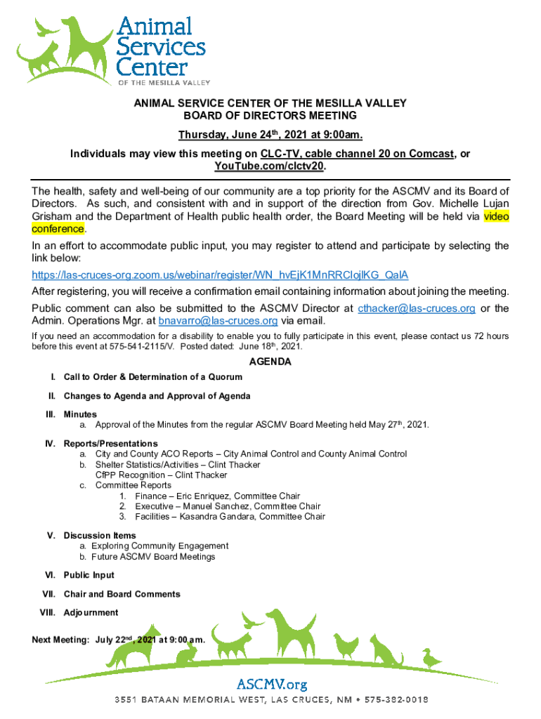 ANIMAL SERVICE CENTER OF THE MESILLA VALLEY BOARD OF DIRECTORS MEETING Thursday, June 24th, 2021 at 9:00am. Individuals may view this meeting on CLCTV, cable channel 20 on Comcast, or YouTube.com/clctv20.