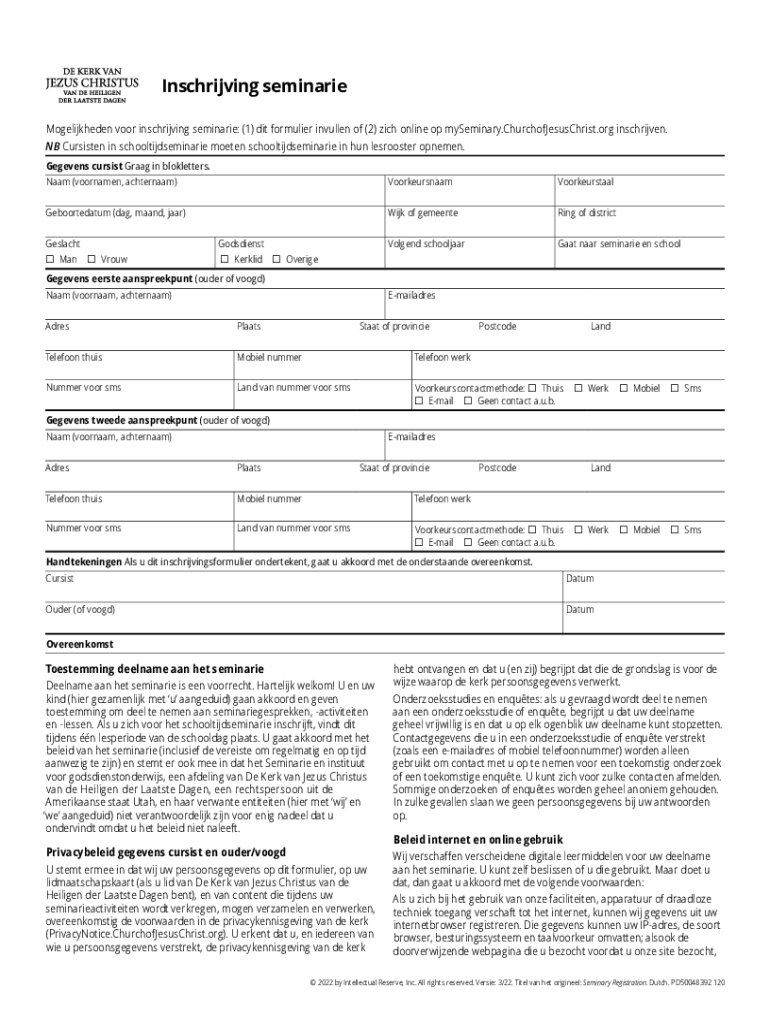 Inschrijving seminarie Mogelijkheden voor inschrijving seminarie: (1) dit formulier invullen of (2) zich online op mySeminary.ChurchofJesusChrist.org inschrijven. NB Cursisten in schooltijdseminarie