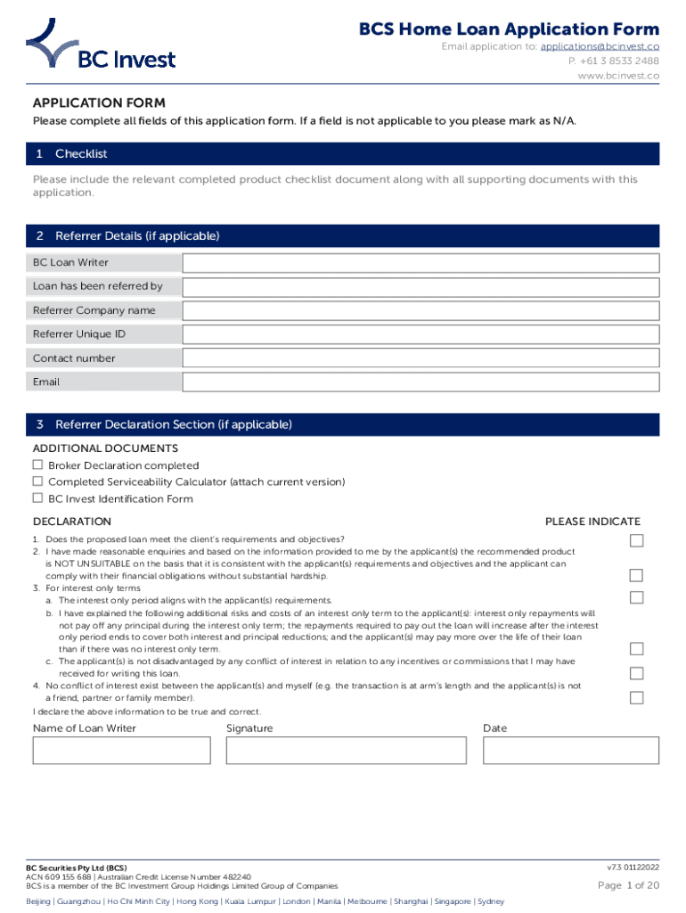 BCS Home Loan Application Form Email application to: applications@bcinvest.co P. +61 3 8533 2488 www.bcinvest.coAPPLICATION FORM Please complete all fields of this application form. If a field is