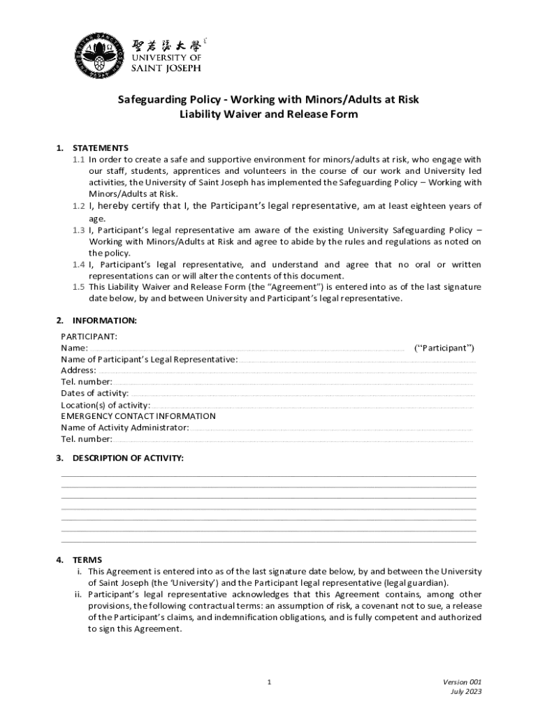 Safeguarding Policy Working with Minors/Adults at Risk Liability Waiver and Release Form 1. STATEMENTS 1.1 In order to create a safe and supportive environment for minors/adults at risk, who engage