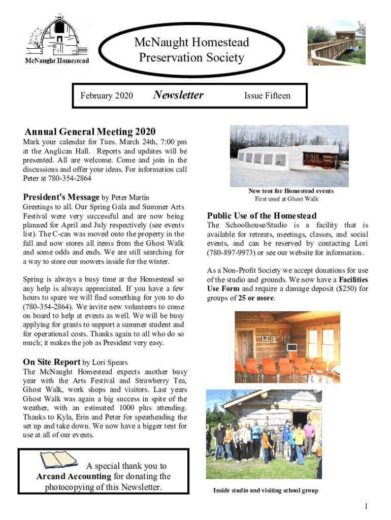 McNaught Homestead Preservation Society February 2020NewsletterIssue FifteenAnnual General Meeting 2020Mark your calendar for Tues. March 24th, 7:00 pm at the Anglican Hall. Reports and updates will
