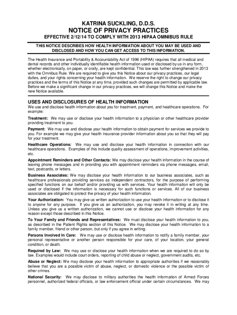 KATRINA SUCKLING, D.D.S.NOTICE OF PRIVACY PRACTICES EFFECTIVE 2/12/14 TO COMPLY WITH 2013 HIPAA OMNIBUS RULE THIS NOTICE DESCRIBES HOW HEALTH INFORMATION ABOUT YOU MAY BE USED AND DISCLOSED AND HOW