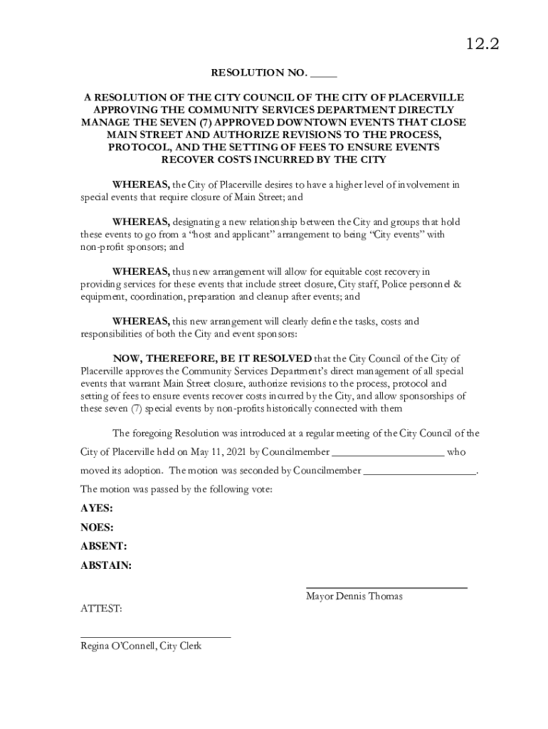 12.2 RESOLUTION NO. ___ A RESOLUTION OF THE CITY COUNCIL OF THE CITY OF PLACERVILLE APPROVING THE COMMUNITY SERVICES DEPARTMENT DIRECTLY MANAGE THE SEVEN (7) APPROVED DOWNTOWN EVENTS THAT CLOSE MAIN