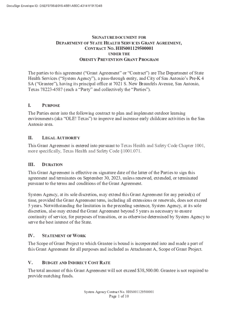DEPARTMENT OF STATE HEALTH SERVICES GRANT AGREEMENT,
