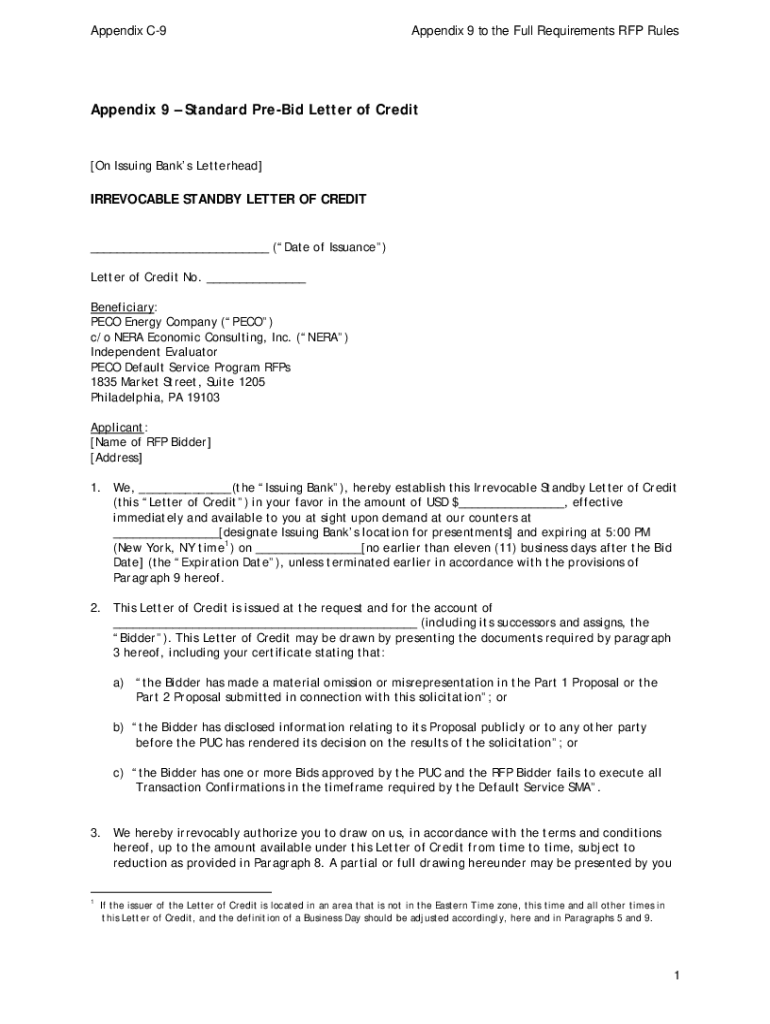 Appendix C9Appendix 9 to the Full Requirements RFP RulesAppendix 9 Standard PreBid Letter of Credit[On Issuing Banks Letterhead]IRREVOCABLE STANDBY LETTER OF CREDIT ___ (Date of Issuance) Letter of