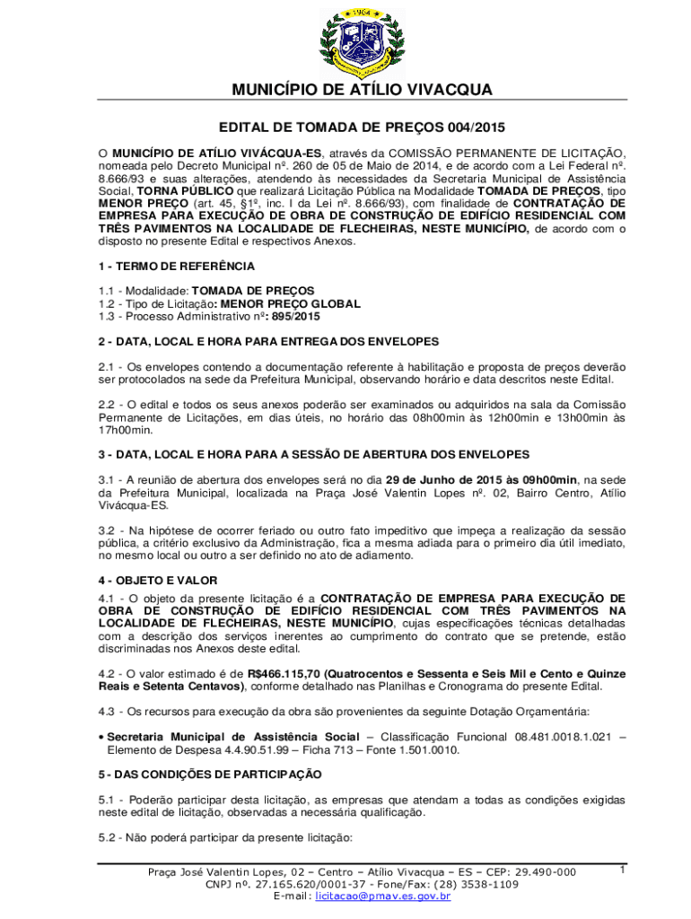 MUNICPIO DE ATLIO VIVACQUA EDITAL DE TOMADA DE PREOS 004/2015 O MUNICPIO DE ATLIO VIVCQUAES, atravs da COMISSO PERMANENTE DE LICITAO, nomeada pelo Decreto Municipal n. 260 de 05 de Maio de 2014, e