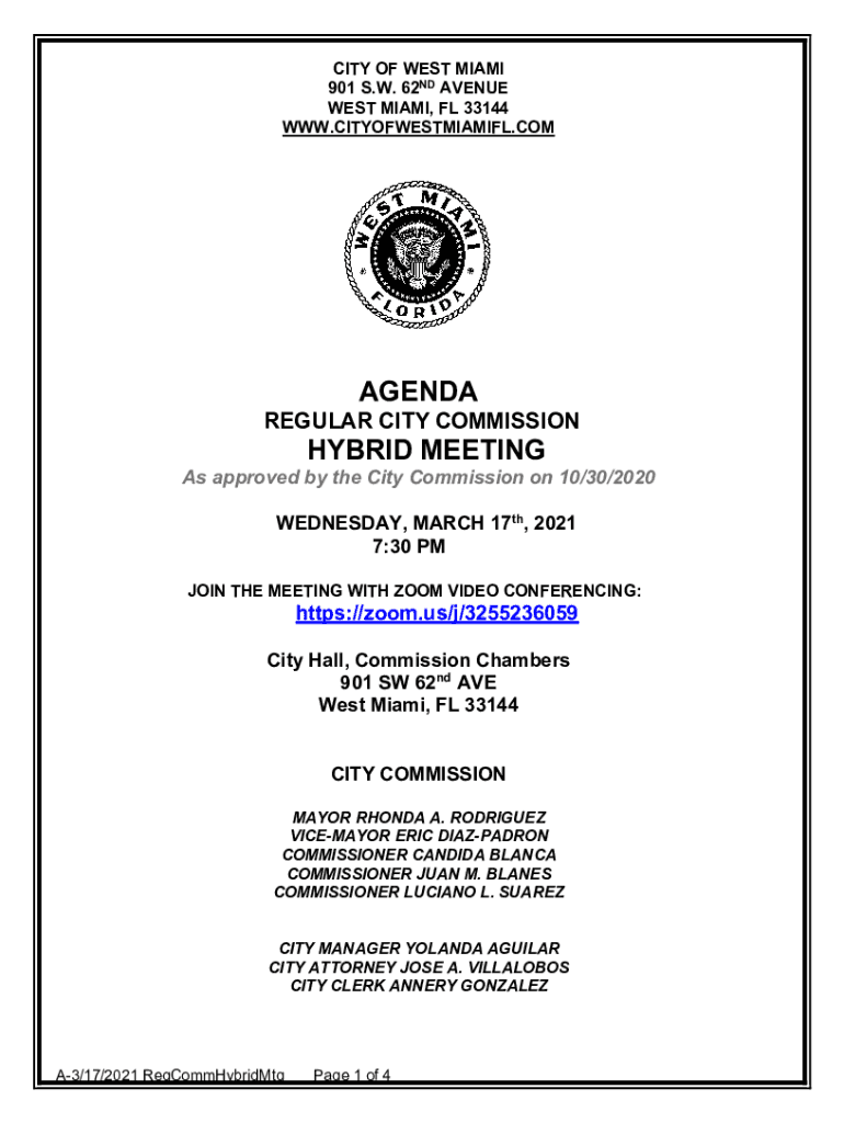 CITY OF WEST MIAMI 901 S.W. 62ND AVENUE WEST MIAMI, FL 33144 WWW.CITYOFWESTMIAMIFL.COMAGENDA REGULAR CITY COMMISSIONHYBRID MEETING As approved by the City Commission on 10/30/2020 WEDNESDAY, MARCH