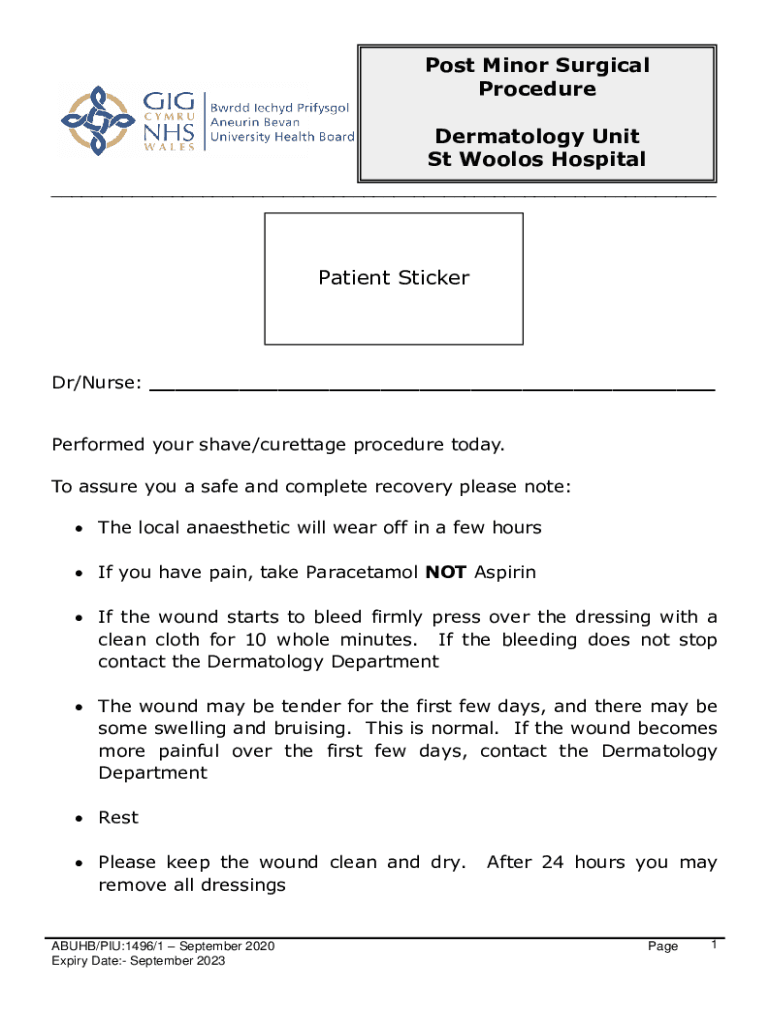Post Minor Surgical Procedure Dermatology Unit St Woolos Hospital ___Patient StickerDr/Nurse: ___ Performed your shave/curettage procedure today. To assure you a safe and complete recovery please