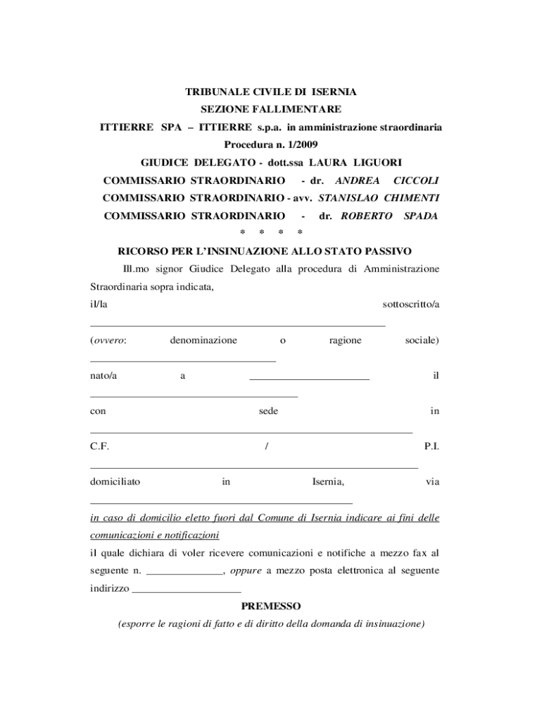 TRIBUNALE CIVILE DI ISERNIA SEZIONE FALLIMENTARE ITTIERRE SPA ITTIERRE s.p.a. in amministrazione straordinaria Procedura n. 1/2009 GIUDICE DELEGATO dott.ssa LAURA LIGUORI COMMISSARIO STRAORDINARIO