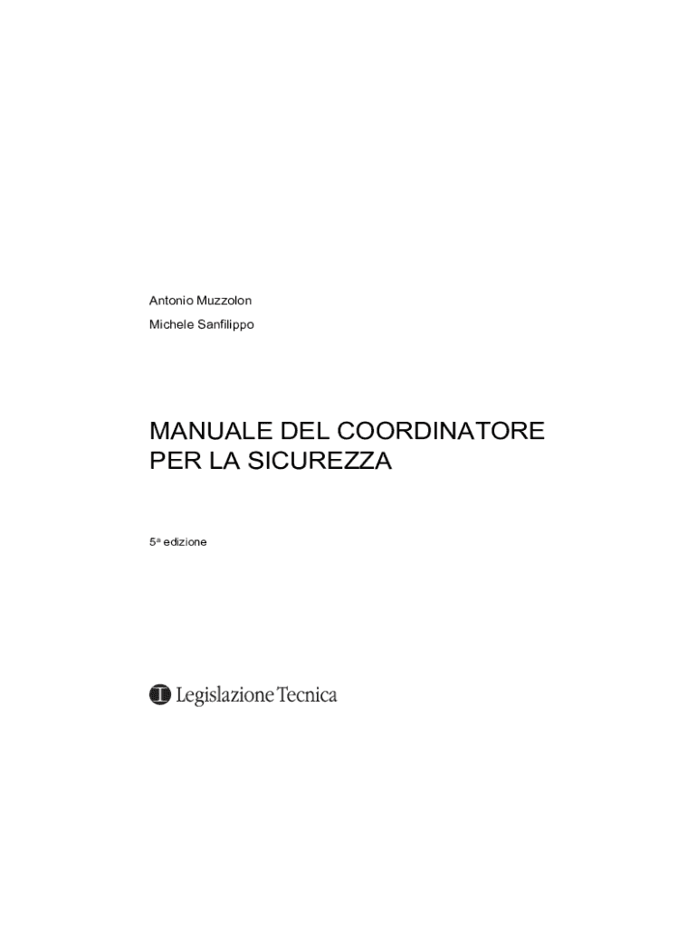 Antonio Muzzolon Michele SanfilippoMANUALE DEL COORDINATORE PER LA SICUREZZA5a edizione Copyright Legislazione Tecnica 2021 La riproduzione, ladattamento totale o parziale, la riproduzione con qualsiasi