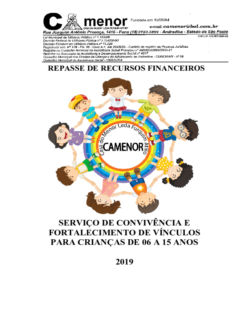 REPASSE DE RECURSOS FINANCEIROSSERVIO DE CONVIVNCIA E FORTALECIMENTO DE VNCULOS PARA CRIANAS DE 06 A 15 ANOS 2019PLANO PARA O REPASSE DE RECURSOS FINANCEIROS DO 2019 1. IDENTIFICAO DA ENTIDADE CNPJ: