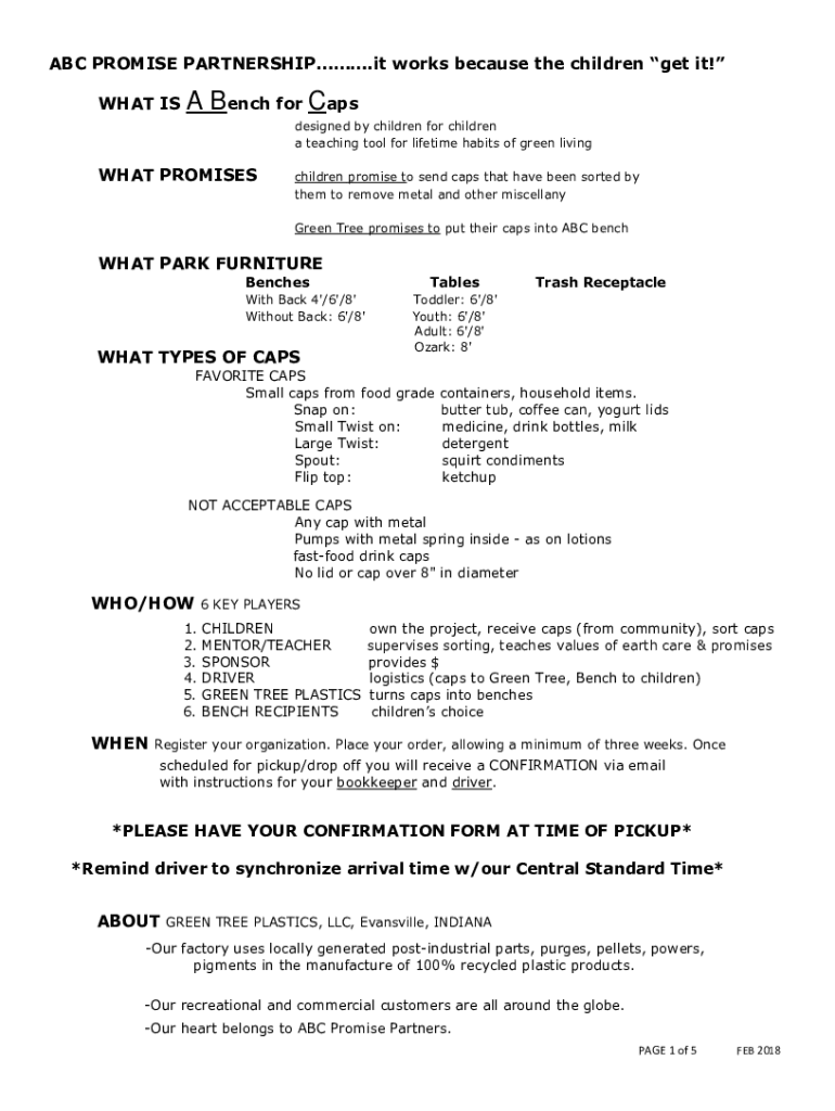 ABC PROMISE PARTNERSHIP.it works because the children get it! WHAT ISA Bench for Caps designed by children for children a teaching tool for lifetime habits of green livingWHAT PROMISESchildren promise