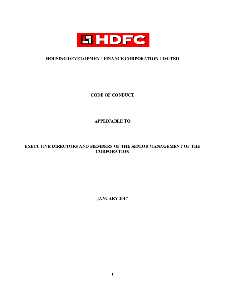 HOUSING DEVELOPMENT FINANCE CORPORATION LIMITEDCODE OF CONDUCTAPPLICABLE TOEXECUTIVE DIRECTORS AND MEMBERS OF THE SENIOR MANAGEMENT OF THE CORPORATIONJANUARY 20171I.PREAMBLE:Trust, integrity, transparency