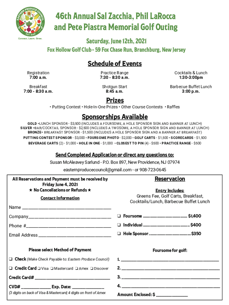 46th Annual Sal Zacchia, Phil LaRocca and Pete Piastra Memorial Golf OutingEST . 19 6 6Saturday, June 12th, 2021Connect. Learn. Grow.Fox Hollow Golf Club 59 Fox Chase Run, Branchburg, New JerseySchedule