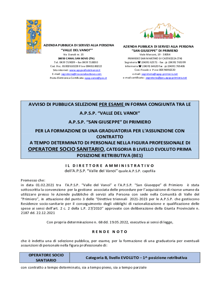 AZIENDA PUBBLICA DI SERVIZI ALLA PERSONA VALLE DEL VANOI Via Danoli nr. 15 38050 CANAL SAN BOVO (TN) Tel. 0439 719009 fax 0439 718830 Cod. Fisc. 81002610228 P.Iva 00481180222 Sito internet: www.apspvalledelvanoi.it