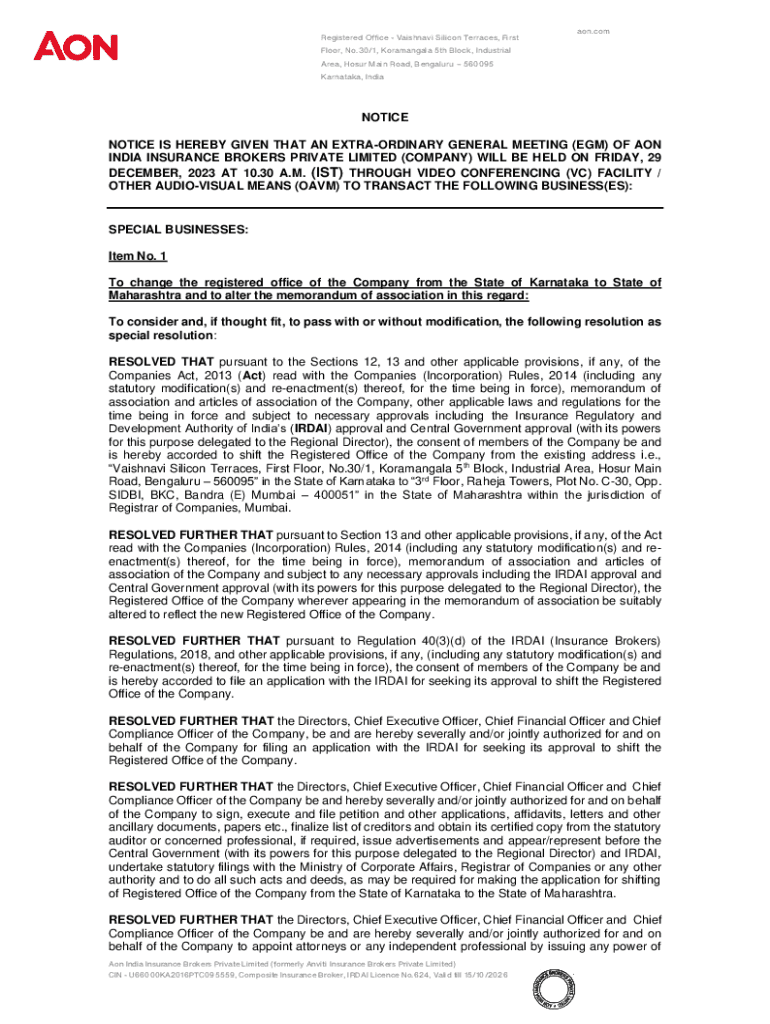 Registered Office Vaishnavi Silicon Terraces, Firstaon.comFloor, No.30/1, Koramangala 5th Block, Industrial Area, Hosur Main Road, Bengaluru 560095 Karnataka, IndiaNOTICE NOTICE IS HEREBY GIVEN THAT