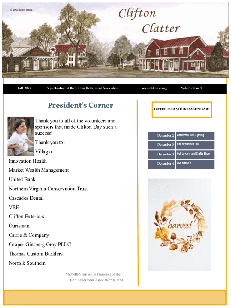 Fall 2022A publication of the Clifton Betterment AssociationPresidents Cornerwww.cliftonva.orgVol. 61, Issue 1DATES FOR YOUR CALENDAR!Thank you to all of the volunteers and sponsors that made Clifton
