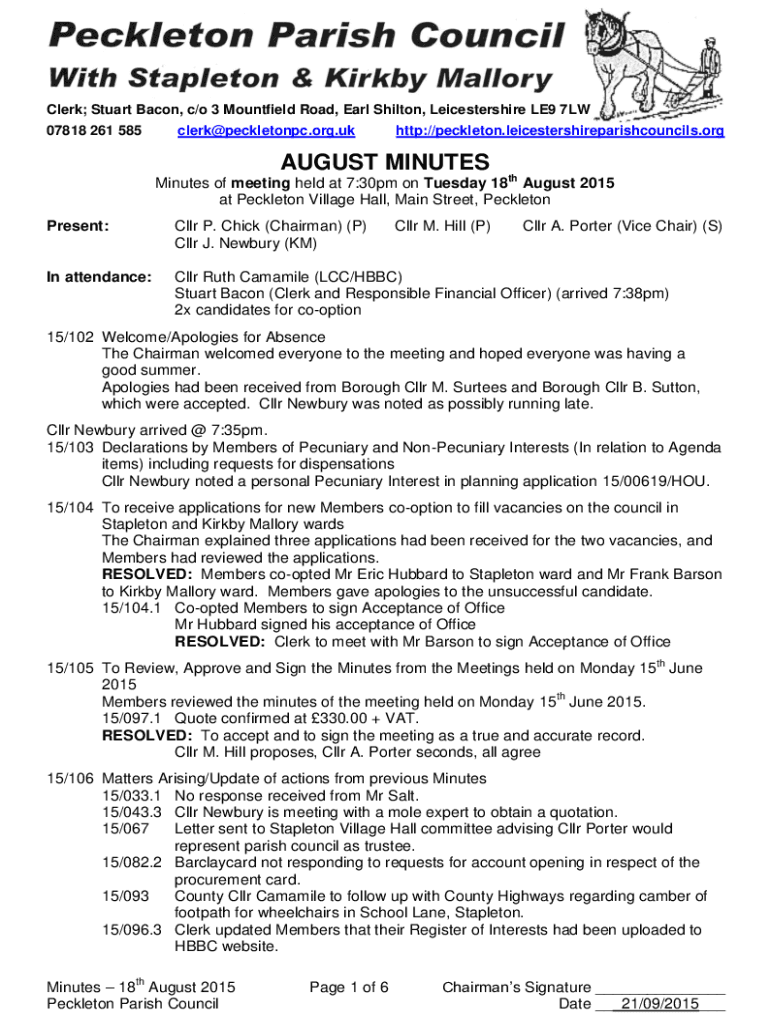 Clerk; Stuart Bacon, c/o 3 Mountfield Road, Earl Shilton, Leicestershire LE9 7LW 07818 261 585clerk@peckletonpc.org.ukhttp://peckleton.leicestershireparishcouncils.orgAUGUST MINUTES Minutes of meeting