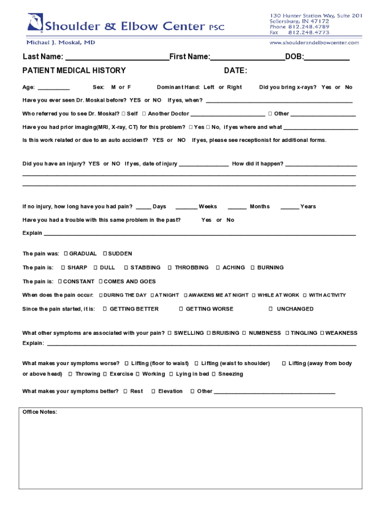 Last Name: ___First Name:___DOB:___ PATIENT MEDICAL HISTORY Age: ___Sex:DATE:M or FDominant Hand: Left or RightHave you ever seen Dr. Moskal before? YES or NODid you bring xrays? Yes or NoIf yes,