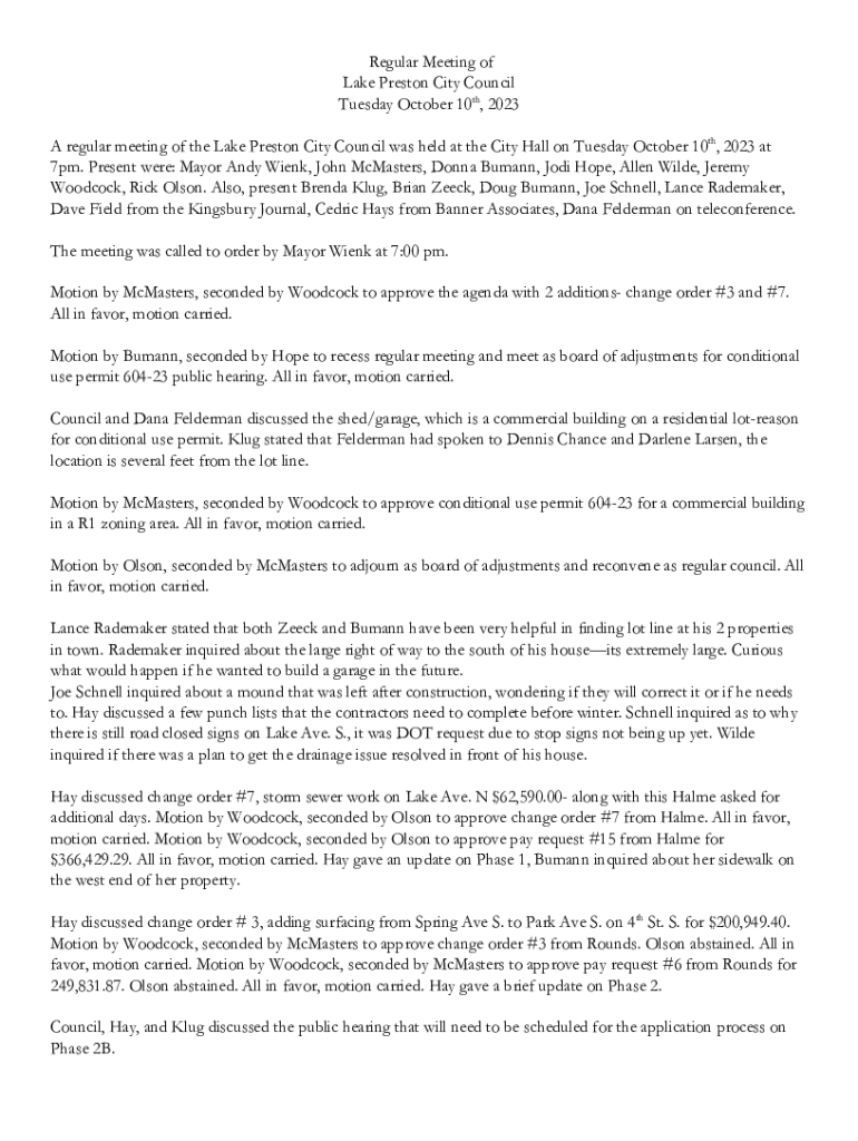 Regular Meeting of Lake Preston City Council Tuesday October 10th, 2023 A regular meeting of the Lake Preston City Council was held at the City Hall on Tuesday October 10th, 2023 at 7pm. Present were: