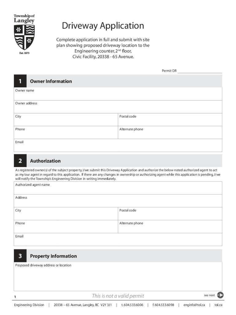 Driveway Application Complete application in full and submit with site plan showing proposed driveway location to the Engineering counter, 2nd floor, Civic Facility, 20338 65 Avenue. Permit DR1Owner