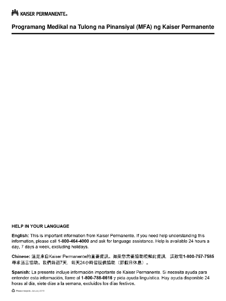 Programang Medikal na Tulong na Pinansiyal (MFA) ng Kaiser PermanentePlease recycle. January 2019Programang Medikal na Tulong na Pinansiyal (MFA) ng Kaiser Permanente Kung kailangan mo ng tulong sa