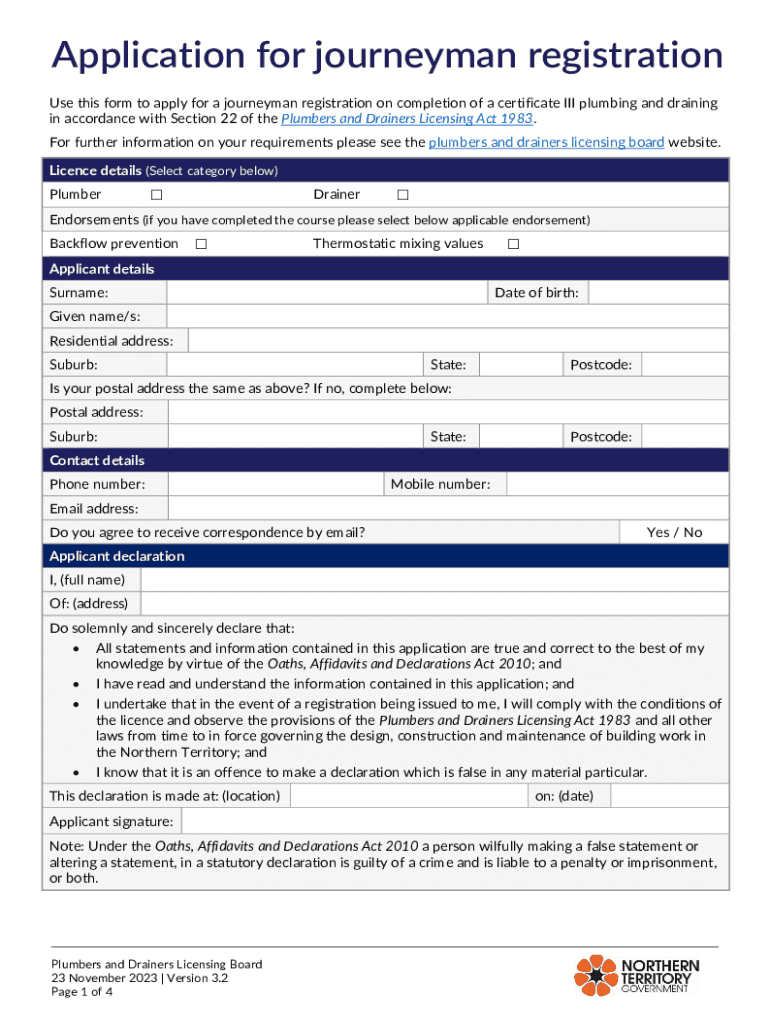 Application for journeyman registration Use this form to apply for a journeyman registration on completion of a certificate III plumbing and draining in accordance with Section 22 of the Plumbers