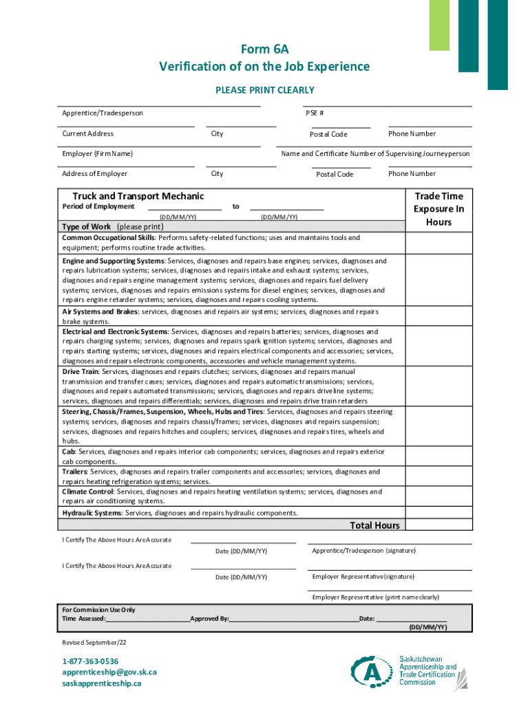 Form 6A Verification of on the Job Experience PLEASE PRINT CLEARLY Apprentice/TradespersonPSE #Current AddressCityPhone NumberPostal CodeEmployer (Firm Name)Name and Certificate Number of Supervising