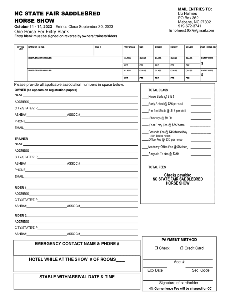 MAIL ENTRIES TO: Liz Holmes PO Box 362 Mebane, NC 27302 9196723741NC STATE FAIR SADDLEBRED HORSE SHOW October 11 14, 2023Entries Close September 30, 2023lizholmes1957@gmail.comOne Horse Per Entry